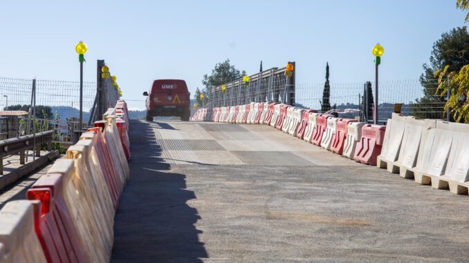 El puente Mabey provisional instalado por la UME en la CV-50 se ha abierto al tráfico este mediodía, tras la finalización de las rampas de acceso y la señalización, por parte de la Generalitat. La circulación por esta pasarela es en ambos sentidos, pero de un solo carril, regulada por semáforos.