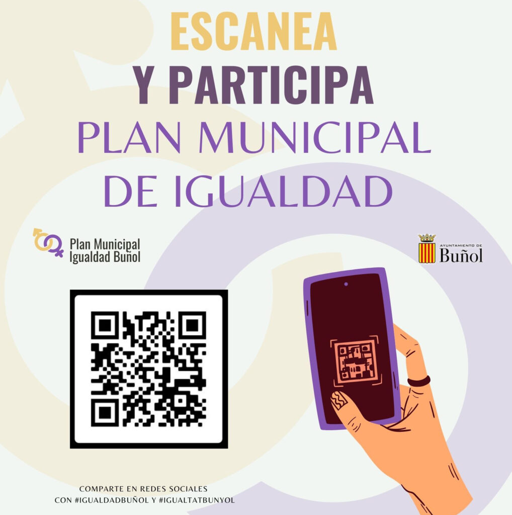 El Ayuntamiento de Buñol lanzó hace unos días el cartel de la presentación del Plan Municipal de Igualdad, en el que invita a toda la ciudadanía. En redes sociales, web del Ayuntamiento y canal de difusión de Radio Buñol se ha lanzado un flyer con el QR en el que permite la participación de la ciudadanía para poder conseguir un plan lo más igualitario y consensuado posible.