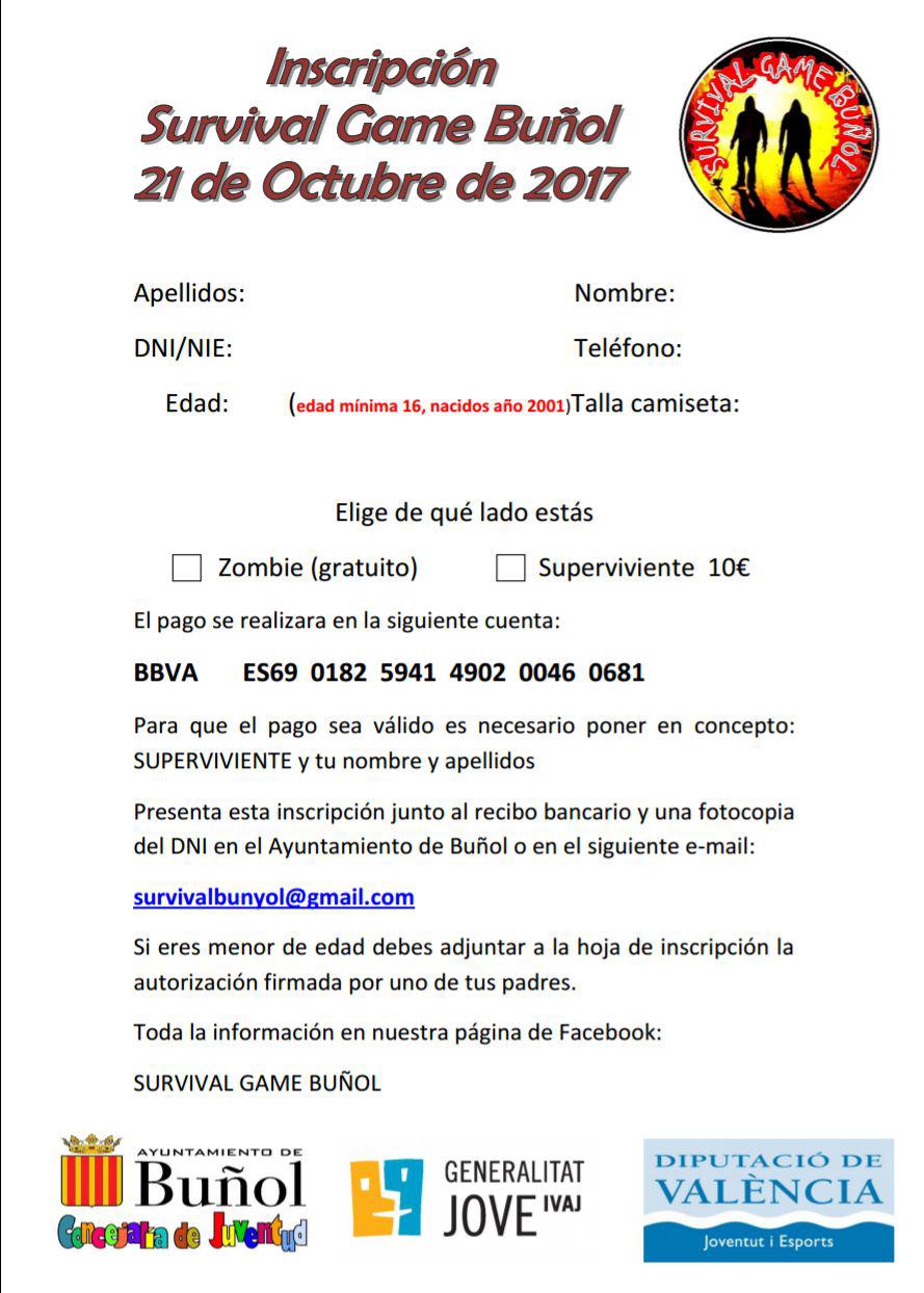 Marta Pérez, edil de Juventud buñolense, recuerda que está abierto el período de inscripción hasta el 13 de octubre. Todos los interesados en formar parte de este juego pueden acudir al Ayuntamiento de Buñol, o a través de la página de Facebook del Survival o a mandar un mail a survivalbunyol@gmail.com