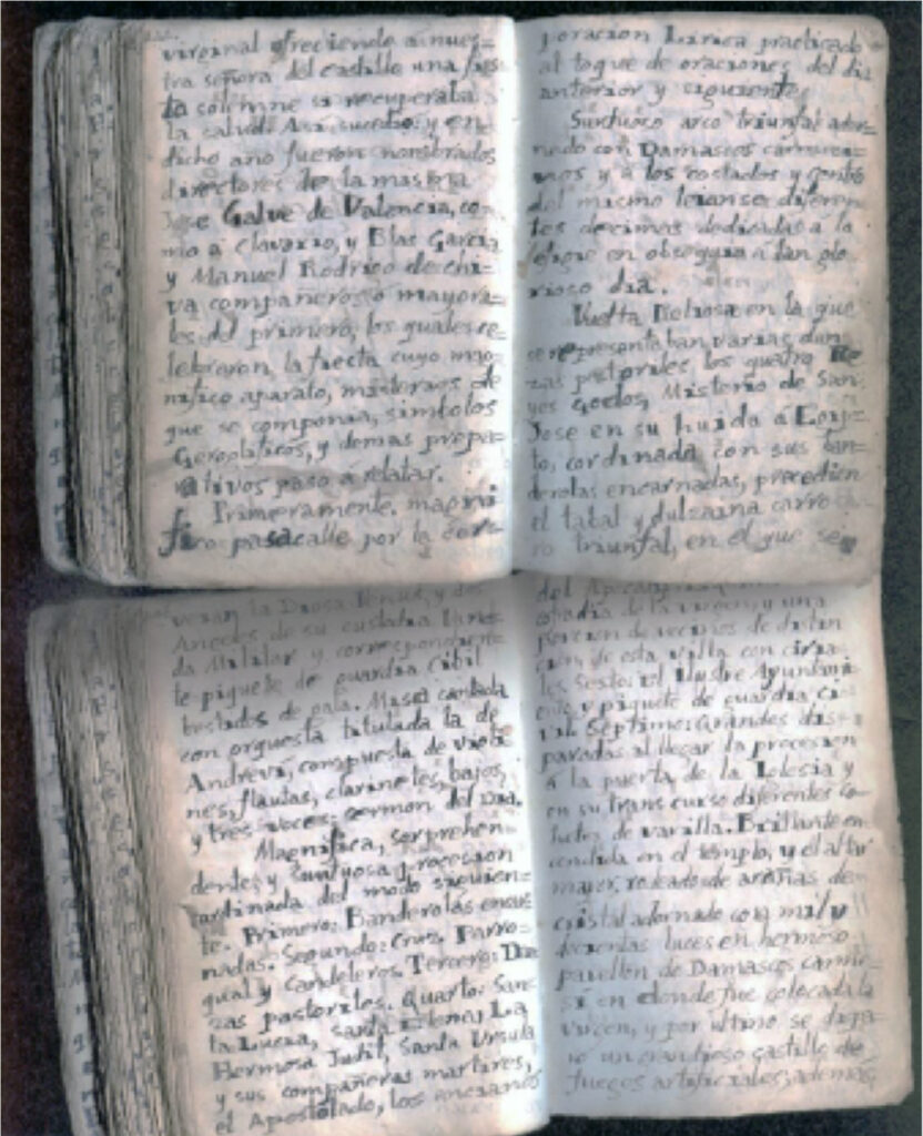 Existeix a Xiva un llibre del segle XIX manuscrit pel Doctor Antonio Cervera, capellà de l’Ermita del Castell a Xiva, gran devot de la Verge del Castell, patrona d’aquesta vila, titulat ‘Llibre Devocionari per al culte a La nostra Senyora del Castell de Xiva’ que, entre moltes altres coses, redacta la festa que se li va oferir a la Verge el dia huit de setembre de 1850, i sobre la part musical diu: …/Primerament magnifique cercavila per la corporació lírica practicat al toc d’oracions del dia anterior i següents. Volta Religiosa en la qual es representaven diverses danses pastorals, els quatro Reis Gots. Misteri de San José en la seua fugida a Egipte, cordinada amb les seues banderoles encarnades, precedint al tabal i dulçaina…/ Vanda Militar i corresponent piquet de guàrdia civil vestits de gala. Missa cantada amb orquestra titulada la de Andreví, composta de violins, flautes, clarinets, baixos, i tres veus…/…