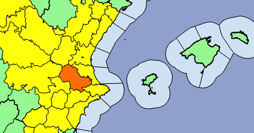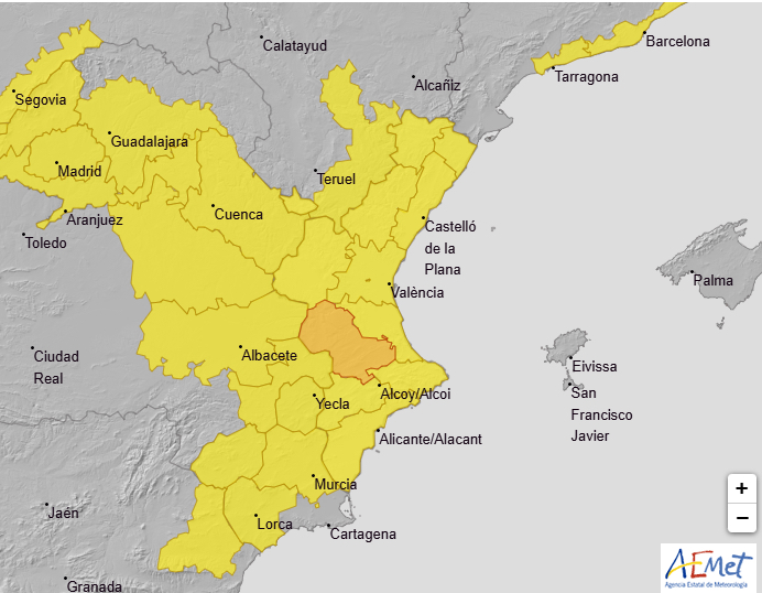 Una alerta que s’ha incrementat fins a nivell taronja a l’interior sud de la província de València per risc de pluges i tempestes poden produir-se tempestes acompanyades de graníssol gran i acumulats de 30 mm/h.