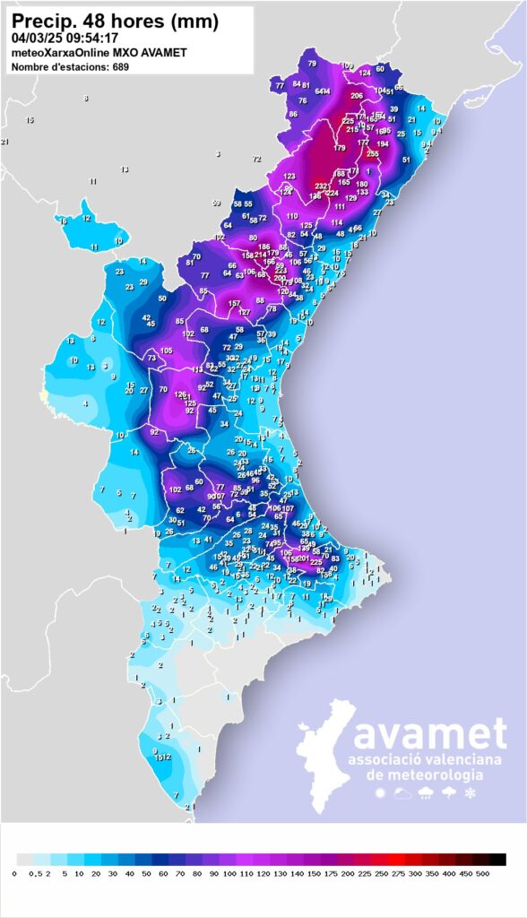 Com es pot comprovar en el mapa sota aquestes línies de l’Associació Valenciana de Meteorologia, Avamet, les precipitacions acumulades en les últimes 48 hores van ser generalitzades en zones d’interior del nord de València i d’interior i prelitoral de Castelló, superant-se els 200 l/m².