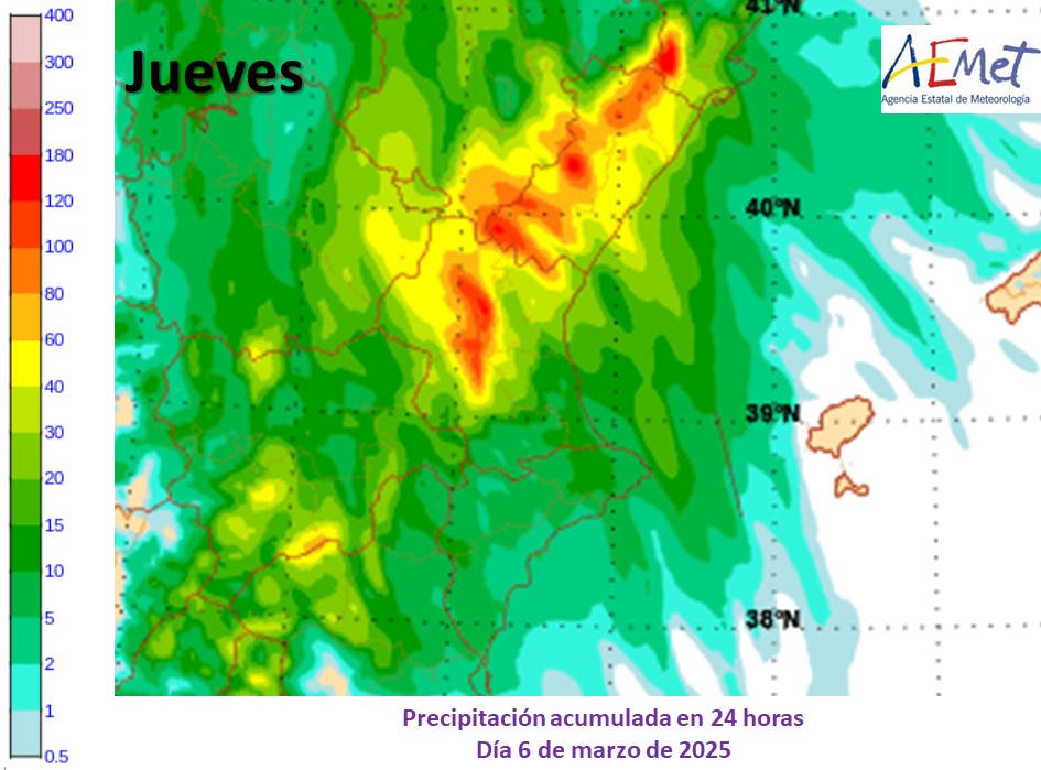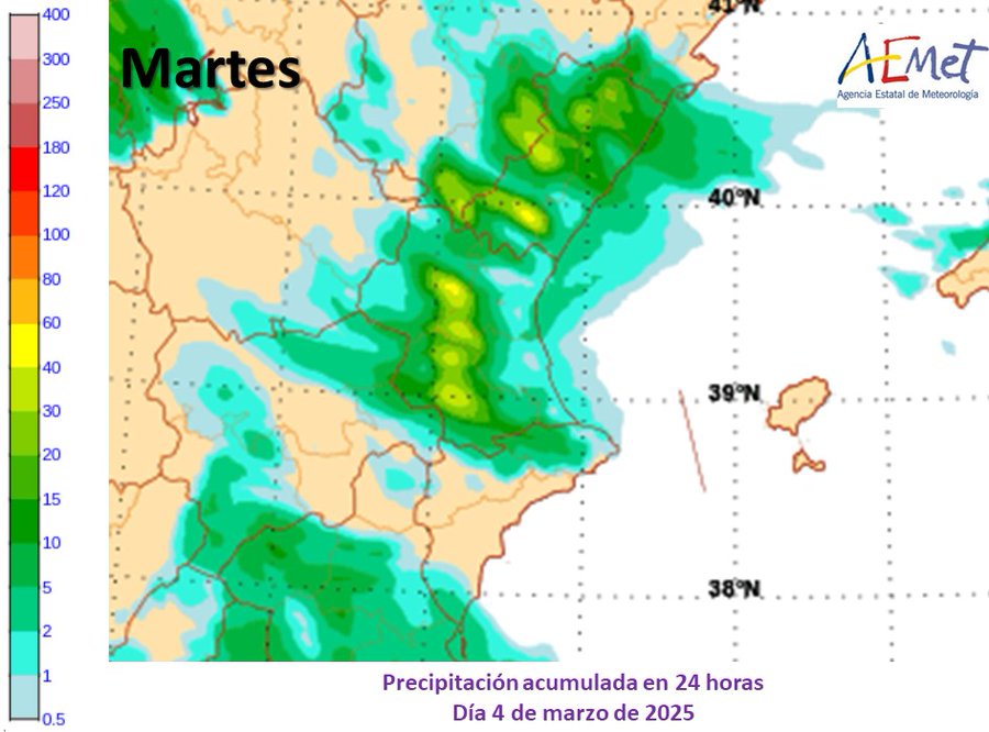 “Encara que mai plou com preveuen els models, amb aquests mapes de precipitació acumulada prevista en 24 hores per a hui, demà i el dijous, podem donar-nos una idea de quins seran les zones més afectades i els dies de més adversitat, que seran dimecres i dijous”, tal com han manifestat des de Aemet.