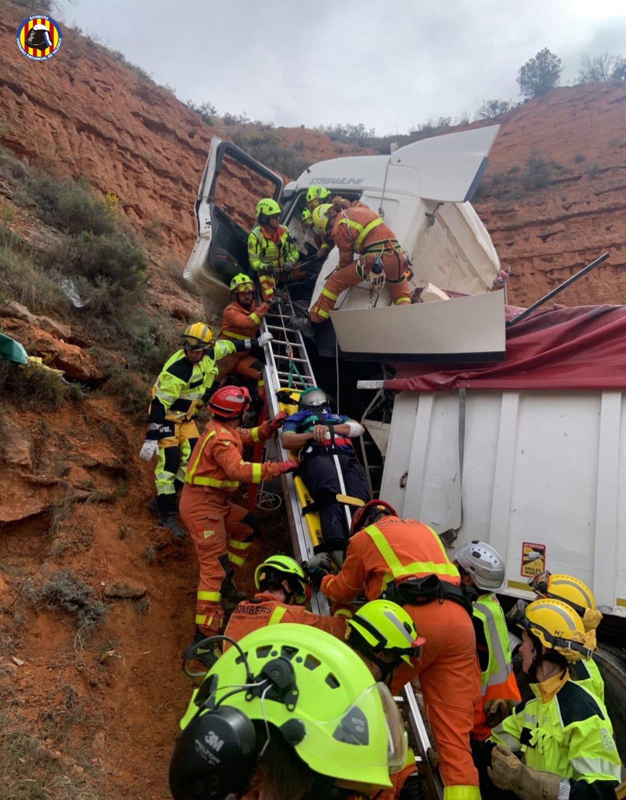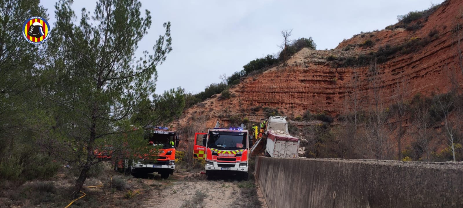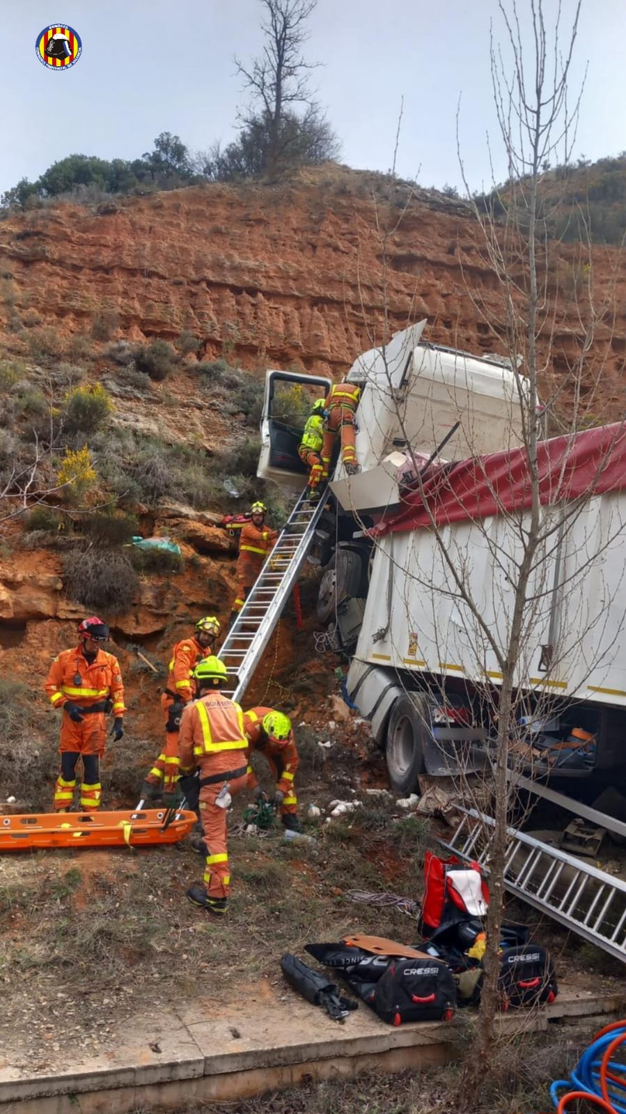 El Consorci de Bombers de València ha intervingut a un aparatós accident a Castielfabib, en la carretera la N-420, on un camió ha patit una eixida de via, quedant el vehicle contra la paret d’una muntanya amb la cabina en posició elevada i el conductor atrapat.
