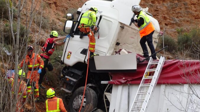 El Consorci de Bombers de València ha intervingut a un aparatós accident a Castielfabib, en la carretera la N-420, on un camió ha patit una eixida de via, quedant el vehicle contra la paret d’una muntanya amb la cabina en posició elevada i el conductor atrapat.