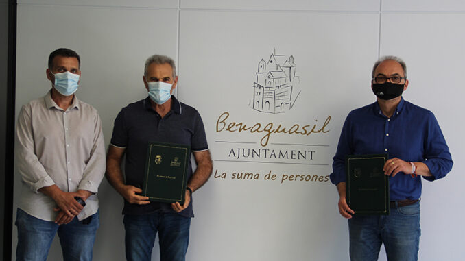 El convenio de arrendamiento del solar de la calle Palau, titularidad de la Cooperativa Rural San Vicent Ferrer de Benaguasil, ha sido rubricado esta mañana entre el presidente de la entidad agrícola, Jose Vicente Navarro y el alcalde Ximo Segarra, en presencia del presidente de la asociación de Empresarios, Jose Díaz.