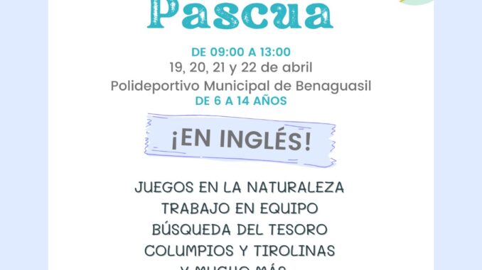 L’Ajuntament de Benaguasil ha organitzat, a través de la regidoria de Joventut, una nova edició de la ‘Escola de Pasqua’ durant les vacances escolars de Setmana Santa, concretament del 19 al 22 d’abril, en horari de demà de 9h a 13h.