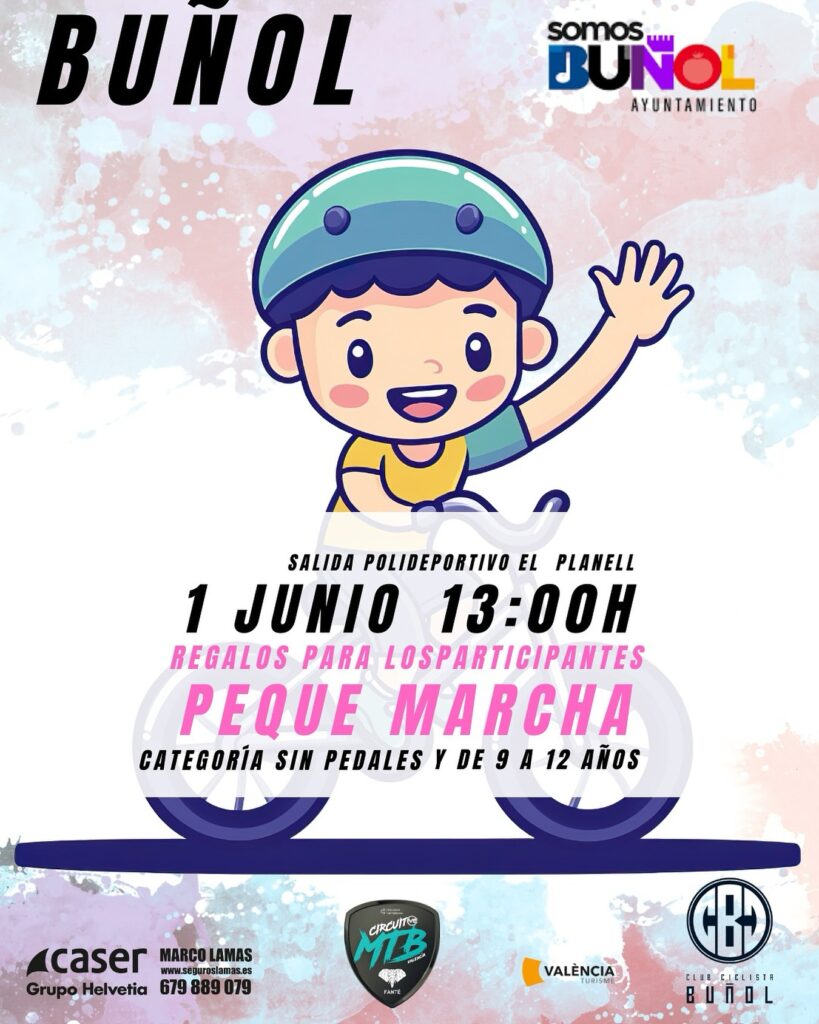 A més, el Club Ciclista Bunyol ha organitzat una Pequemarcha gratuïta dirigida a xiquets i xiquetes d’entre 5 i 12 anys. Aquesta prova infantil començarà a partir de les 13.00 h, després de la finalització de la carrera principal, i comptarà amb obsequis per a tots els participants. Les categories infantils seran: sense pedals; de 5 a 8 anys i de 9 a 12 anys.