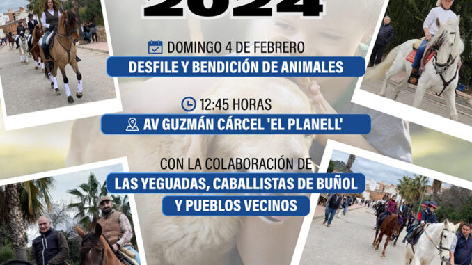 Aquest diumenge, 4 de febrer, a les 12,45 hores, l’Avinguda Guzmán Cárcel de “El Planell” acollirà la tradicional desfilada i benedicció d’animals per la festivitat de Sant Antón. En ella es comptarà amb la participació d’eguades i caballistas de Bunyol i de pobles veïns.