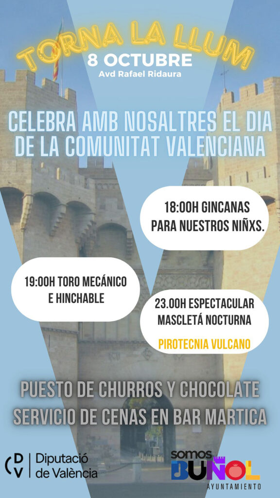 L’Ajuntament de Bunyol celebra aquest dimarts, 8 d’octubre, el Dia de la Comunitat Valenciana amb l’esdeveniment “Torna la llum”, que es durà a terme a partir de les 18,00 hores en l’Avinguda Rafael Ridaura.