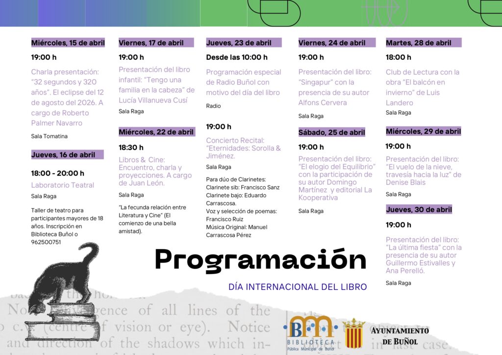 Bunyol commemora el Dia Internacional del Llibre amb una àmplia i variada programació d’activitats culturals que es desenvoluparan al llarg del mes d’abril, amb propostes per a tots els públics que combinen literatura, música, teatre i divulgació.