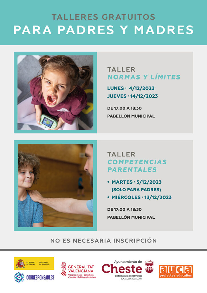 En total s’impartiran quatre tallers en horari de vesprades, de 17.00 a 18.30, en el pavelló municipal. El taller que s’impartirà hui versarà sobre normes i límits, i demà, dimarts, hi ha programada una sessió sobre competències parentals, destinada només a públic masculí. El dimecres, 13 de desembre, es repetirà el taller sobre normes i límits i, el dijous 14, la sessió de competències parentals, en aquesta ocasió oberta a pares i mares. Per a assistir no serà necessari realitzar una inscripció prèvia.