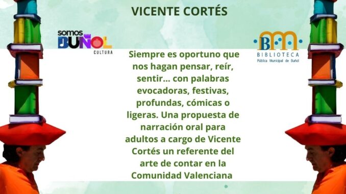 Aquest divendres, 11 d’abril a les 19,00 hores, la Biblioteca Municipal de Bunyol, a la seua Sala Raga, acollirà l’espectacle “Contes per a adults”, una proposta de narració oral a càrrec del reconegut narrador Vicente Cortés.