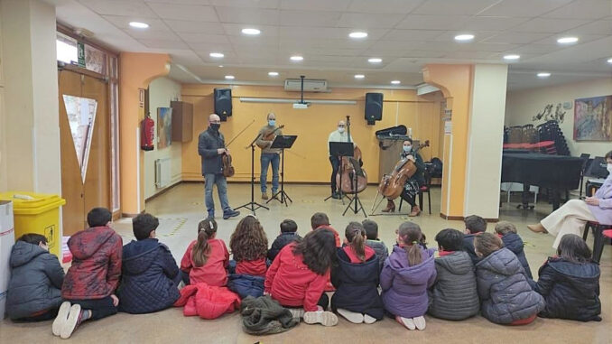 Amb el propòsit de promocionar la corda i acostar-los als més xicotets la música, dilluns passat 28 de març visitava el Conservatori Professional de Música “Sant Rafael”, alumnat del Col·legi Sagrada Família- Talaia. Les xiquetes i xiquets van poder veure de primera mà els instruments de corda que van formar el quartet dels professors José Guerrero (violí), Juan García (viola), Sheyla Carrascosa (violoncel), i Valeriano Hernández (contrabaix).