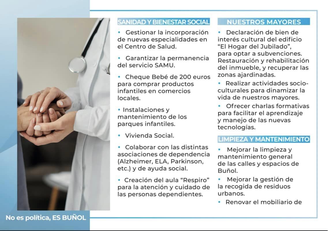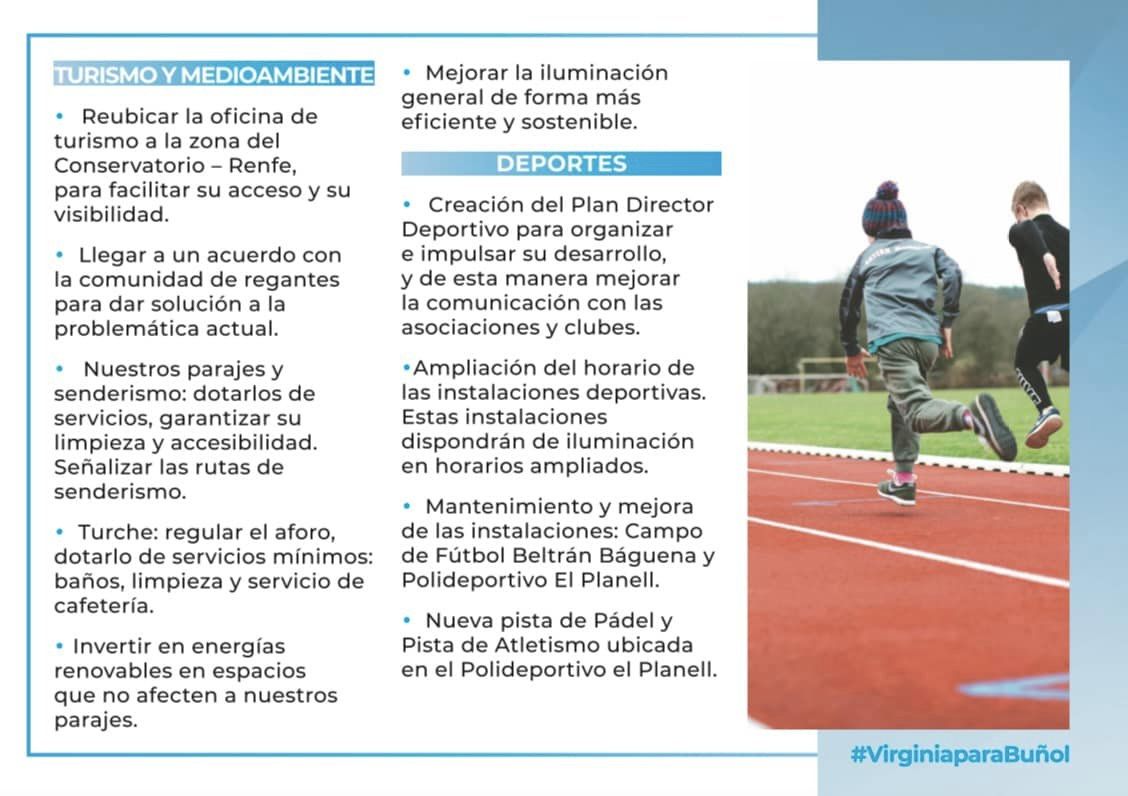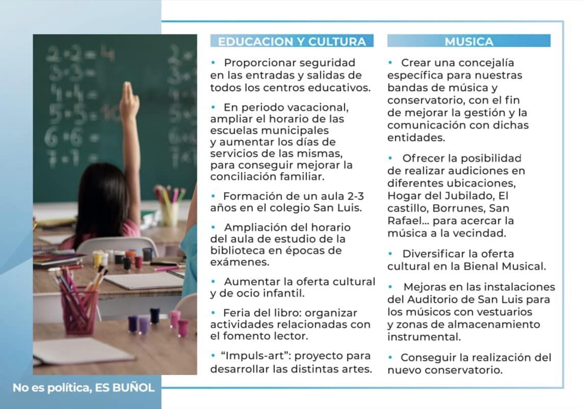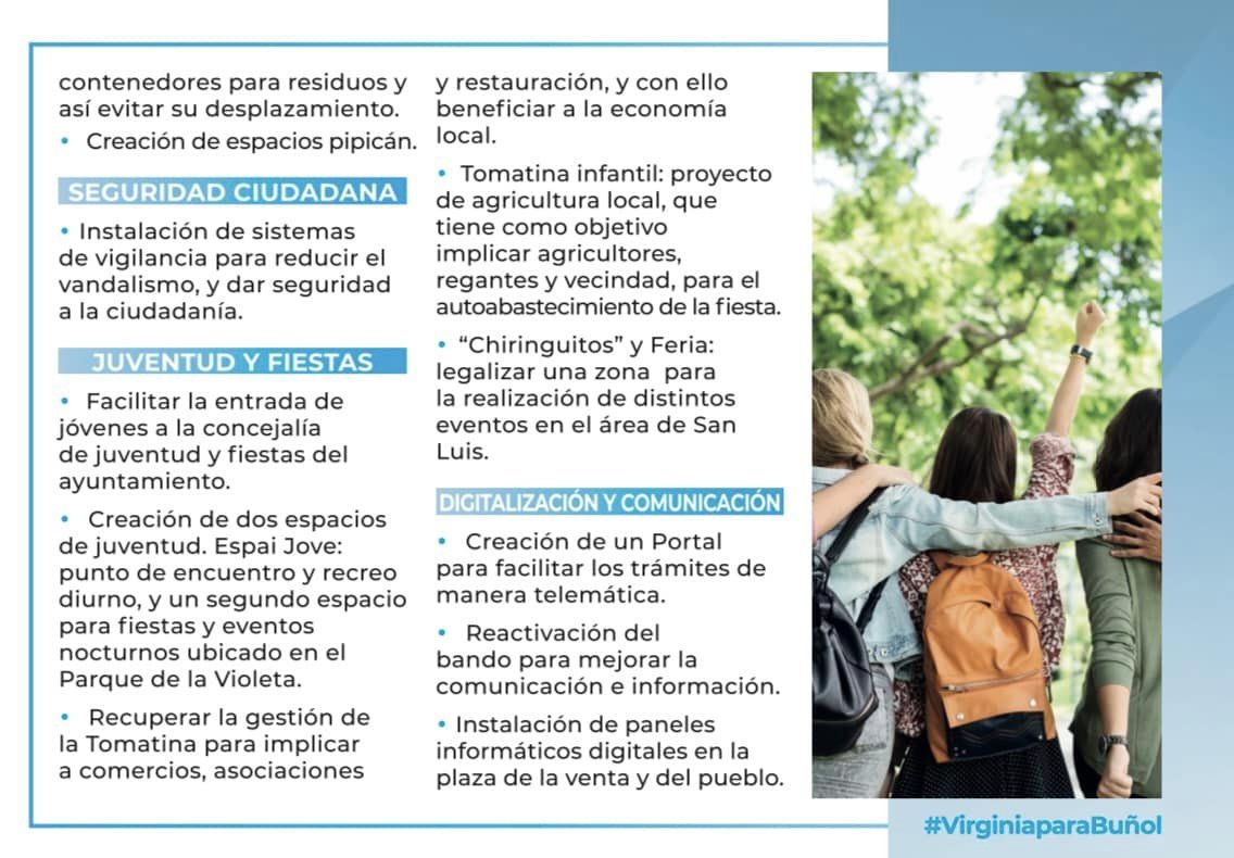 El Partit Popular de Bunyol ha presentat el seu programa electoral en un acte públic en la Plaça del Poble, en l’acte en el qual van intervindre els membres de la candidatura, encapçalats per Virginia Sanz, van posar l’accent en el seu eslògan “Perquè no és política és Bunyol” fent una sèrie de propostes amb les quals millorar Bunyol en aquests pròxims quatre anys.
