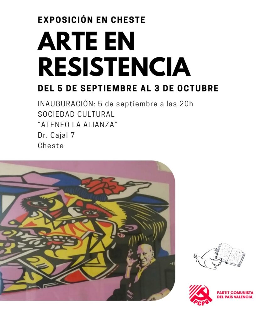 El Partit Comunista del País Valencià (PCPV), en col·laboració amb la societat Ateneu de Xest, inaugura este divendres 5 de setembre, a les 20 hores, l’exposició Arte en Resistencia, una mostra que reuneix obres de destacats autors com Pablo Picasso, Juan Genovés, l’Equip Crònica o Rafael Alberti, entre altres.