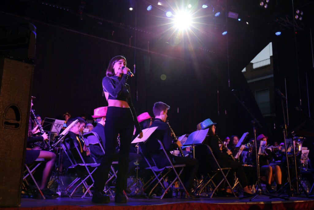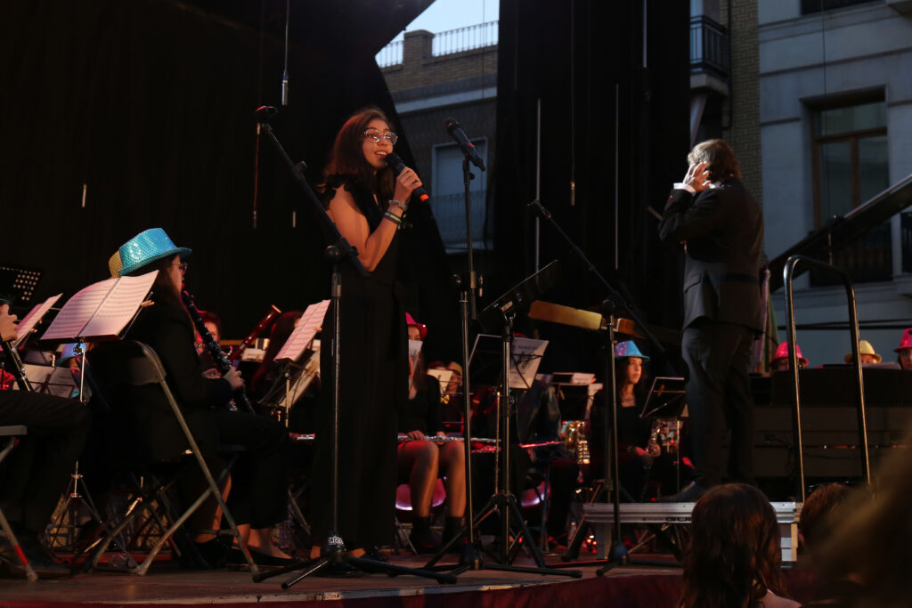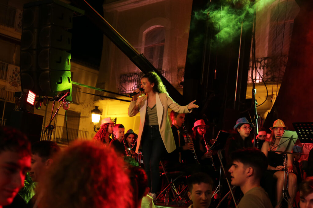 L’acte va estar conduït per l’actriu chestana Estela Domínguez, qui també va cantar un parell de temes al costat dels més de 80 músics i músiques que ocupaven l’escenari, sota la batuta de Gustavo López Aceituno.
