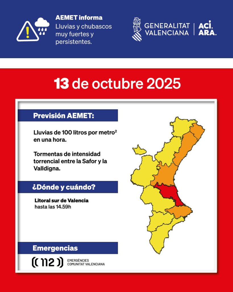 A més, s’amplia l’alerta groga en altres zones de la Comunitat Valenciana, com les comarques de La Foia, Camp de Túria i La Regió muntanyenca; i es manté l’avís taronja en el litoral de Castelló, València i nord d’Alacant