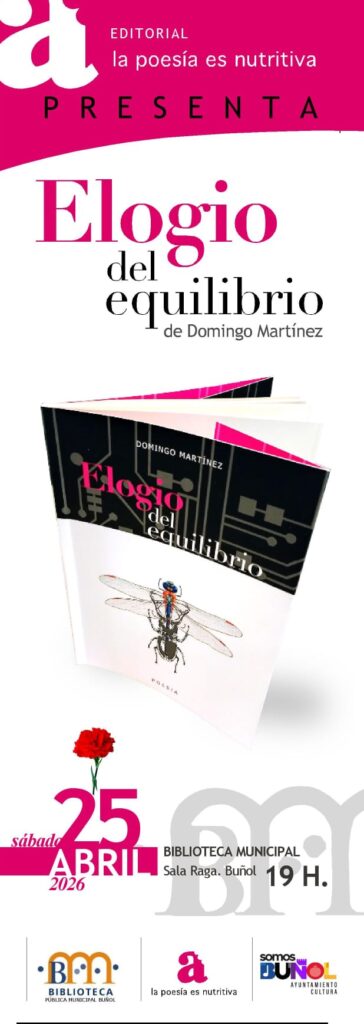 Entre les seues publicacions poètiques es troba Visión que nada precipita (1984); Paseos en moto con sidecar (2009); i este Elogio del equilibrio (2026), prologat pel filòleg Xabier Botella Gras i editat en la col·lecció “La poesía es nutritiva” amb el número quatre. És esta una editorial Kooperativa autofinançada, que creiem els qui la impulsem, aposta per la poesia des dels més baixos fons (monetaris) però des de la voluntat més ferotge i rebel en este camí de paraules i sentit, que vam emprendre ja fa uns anys.