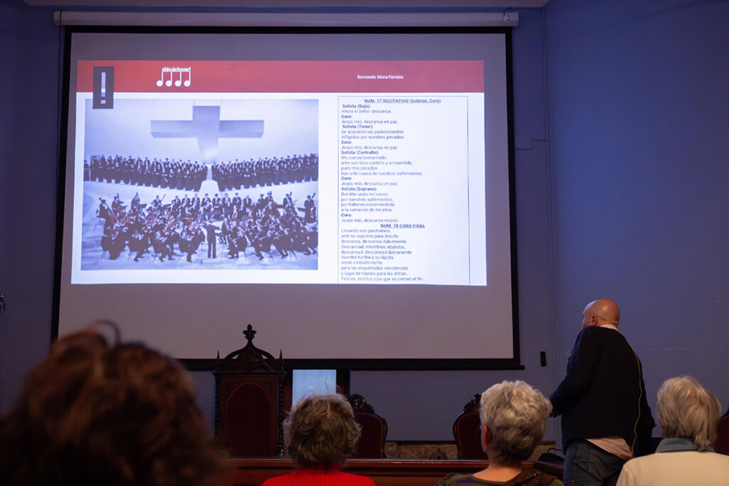Durant el cicle s’han abordat diferents èpoques de la història de la Música i altres temàtiques com “Les profunditats emocionals” o “l’amor en la música”. L’última sessió ha versat sobre la Setmana Santa i en ella s’ha analitzat en profunditat l’obra Passió segons Sant Mateu de Johann Sebastian Bach.