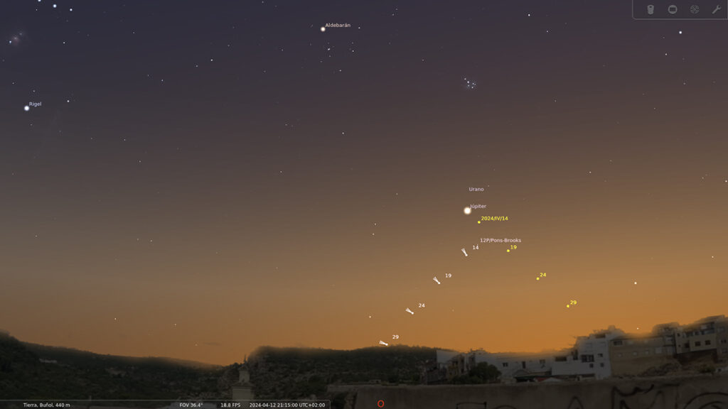 Les possibilitats de veure el cometa des de Bunyol disminueixen conforme transcorre el mes d’abril, els càlculs obtinguts del programa Stellarium confirmen que a la fi de mes l’altura del cometa és tan baixa que a les 21.15 hores ja estarà sota l’horitzó oest. No obstant això la seua lluentor augmentarà lleugerament fins al 21 (moment del periheli) i a partir del 23 anirà disminuint conforme es vaja allunyant del Sol. Informa, Roberto Palmer (Físic-astrònom).