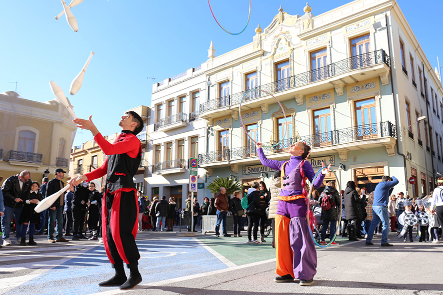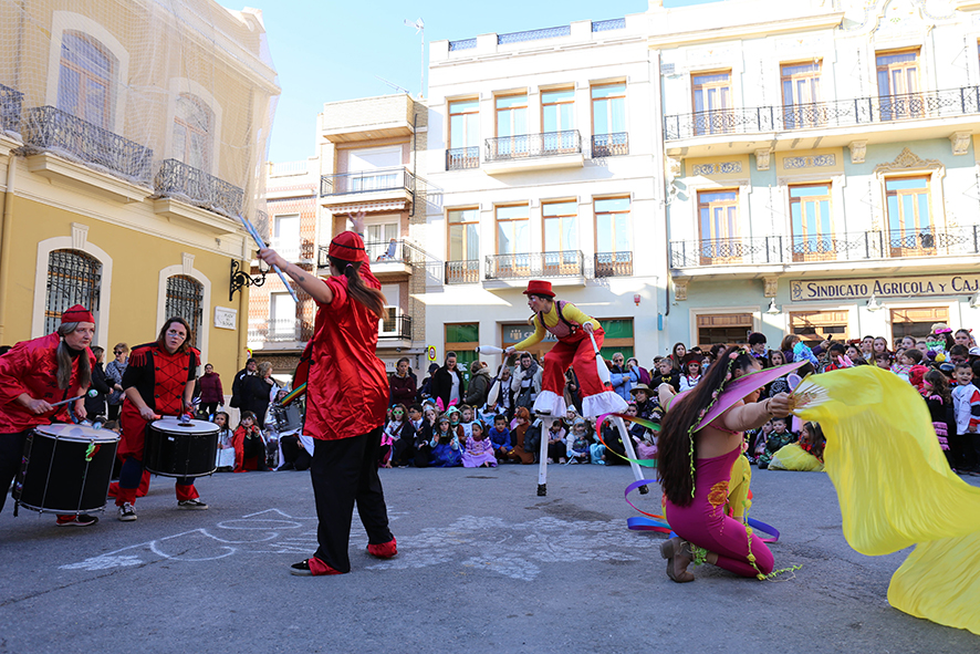 La celebració ha comptat amb tres batukadas i animació a càrrec de la companyia Baraka Circ, que han guiat a alumnat i professorat dels tres col·legis des del seu centre fins a la plaça, per a iniciar des d’allí el cercaviles. Davant el cridaner ritme de les batukadas, desenes de veïns i veïnes s’han congregat en la plaça per a compartir amb els xiquets i xiquetes l’ambient d’alegria i diversió que s’ha viscut tant a les portes de l’ajuntament, on Baraka Circ ha oferit una actuació de malabars, cinta, cércols, humor i percussió, com al carrer Xiva.