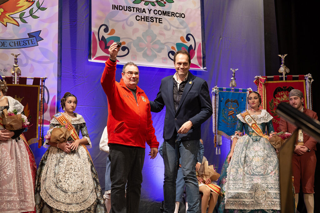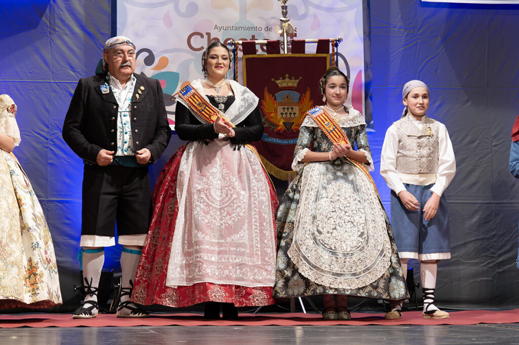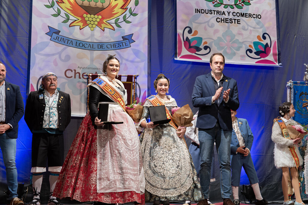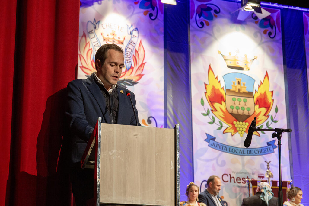 Després de les anomenada als membres Junta Local Fallera, els representants de la Falla Barri de l’Alegria, de la Falla Barri Indústria i Comerç i de la Junta Local van irrompre en el teatre, entre els aplaudiments de les persones assistents. L’alcalde, José Morell, i el regidor de Festes, Óscar Galdón, també van ser anomenats abans de començar el pregó. Amb l’escenari ja complet, les falleres majors de les dues Falles de la població i de la Junta Local Fallera, acompanyades pels seus Presidents, van convidar als chestanos i a les chestanas a gaudir de les Festes Josefinas, compartint la seua mateixa il·lusió, i van coincidir a enaltir en els seus discursos la unió fallera per a la reconstrucció després de la DANA. Els representants de les dues comissions van rebre les insígnies de mans de l’alcalde i del regidor, i també va ser entregat un ram de flors a cada fallera major. Per part seua, les falleres de la Junta local van rebre les claus de la ciutat i rams de flors, de mans de Morell.