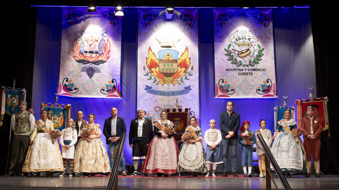 Després de les anomenada als membres Junta Local Fallera, els representants de la Falla Barri de l’Alegria, de la Falla Barri Indústria i Comerç i de la Junta Local van irrompre en el teatre, entre els aplaudiments de les persones assistents. L’alcalde, José Morell, i el regidor de Festes, Óscar Galdón, també van ser anomenats abans de començar el pregó. Amb l’escenari ja complet, les falleres majors de les dues Falles de la població i de la Junta Local Fallera, acompanyades pels seus Presidents, van convidar als chestanos i a les chestanas a gaudir de les Festes Josefinas, compartint la seua mateixa il·lusió, i van coincidir a enaltir en els seus discursos la unió fallera per a la reconstrucció després de la DANA. Els representants de les dues comissions van rebre les insígnies de mans de l’alcalde i del regidor, i també va ser entregat un ram de flors a cada fallera major. Per part seua, les falleres de la Junta local van rebre les claus de la ciutat i rams de flors, de mans de Morell.