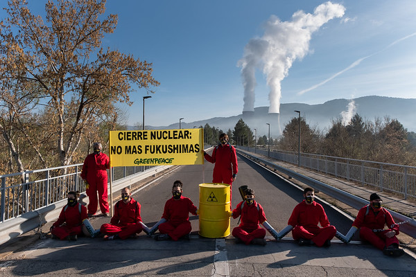 11/03/2021. Cofrentes, Valencia, Comunidad Valenciana, España.rrActivistas de Greenpeace se encadenan en el acceso a la central nuclear de Cofrentes (Valencia) para pedir al Gobierno su cierre definitivo. Coincidiendo con el 10º aniversario del accidente de Fukushima, la organización ecologista rdemanda al Gobierno que no repita el error cometido hace una década al conceder una nueva licencia de funcionamiento a la central, que expira el próximo 20 de marzo.rrHoy no es un día cualquiera: hace una década, en febrero de 2011, una veintena de activistas de Greenpeace entraron en la central nuclear de Cofrentes y escalaron a una de las torres de refrigeración. En esa acción pintaron en la torre de refrigeración el mensaje Peligro Nuclear para exigir que no se renovara la licencia para que siguiese operando. Pocos días después, un 11 de marzo como hoy, en Japón, la Central nuclear de Fukushima pasaba a la historia por sufrir el peor desastre nuclear desde Chernóbil en 1986.rrDespués de una década, volvemos al lugar de los hechos para exigir, una vez más, que no se renueve la licencia de Cofrentes porque si algo hemos aprendido en este tiempo, es que que las nucleares son instalaciones envejecidas y que no las necesitamos para mantener la seguridad del suministro; y por lo tanto, no debemos renovar sus licencias sin, además, la participación de la ciudadanía en la toma de decisiones (algo que sí se pide para cualquier pequeña instalación energética y renovable).r©Greenpeace/Pedro Armestrerr©Greenpeace Handout/Pedro Armestre – No sales – No Archives – Editorial Use Only – Free use only for 14 days after release. Photo provided by GREENPEACE, distributed handout photo to be used only to illustrate news reporting or commentary on the facts or events depicted in this image.