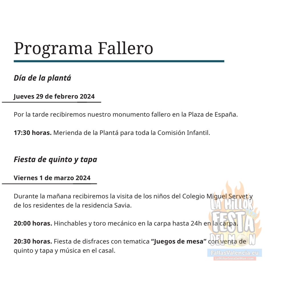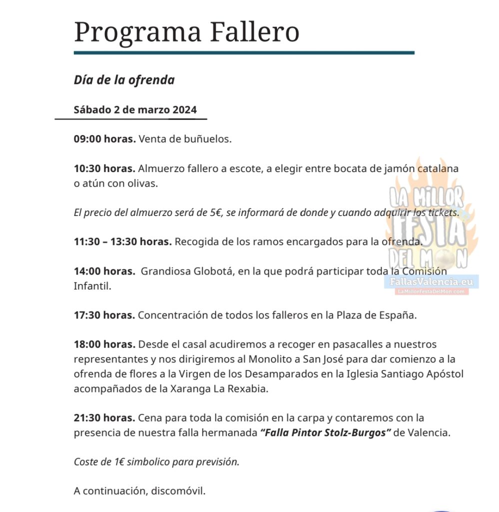 La comissió de la Falla Alboraig, que aquest 2024 està representada per Chloe Santoyo Friginal, Fallera Major Infantil i Daniel Juanes Marco, President Infantil, així com per Jessica Marco Martínez, Fallera Major, al costat de la seua presidenta, Merche Calvo Sanchís, ha preparat un complet programa festiu.