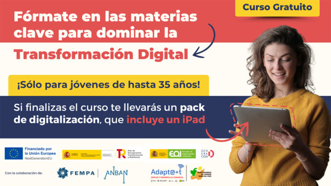 El curs “Expert en Transformació Digital – Agents del Canvi” és gratuït i arranca el 30 d’octubre, dirigit a joves de fins a 35 anys que es troben desocupats, treballen com a autònoms o estiguen ocupats en pimes.