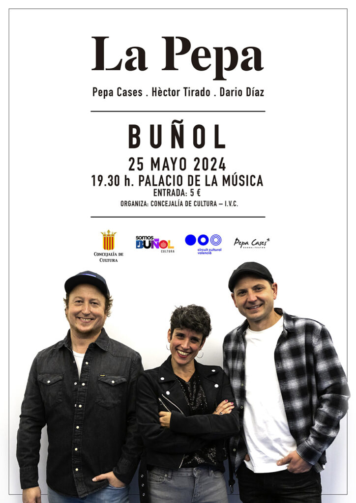La Pepa, coneguda pel seu estil fresc i enèrgic, promet una vesprada plena de bona música. Pepa Cases acompanyada per Héctor Tirado i Dario Díaz, porta a Bunyol una innovadora proposta musical que comprén una selecció dels seus millors temes, així com noves composicions que reflecteixen la seua evolució artística.