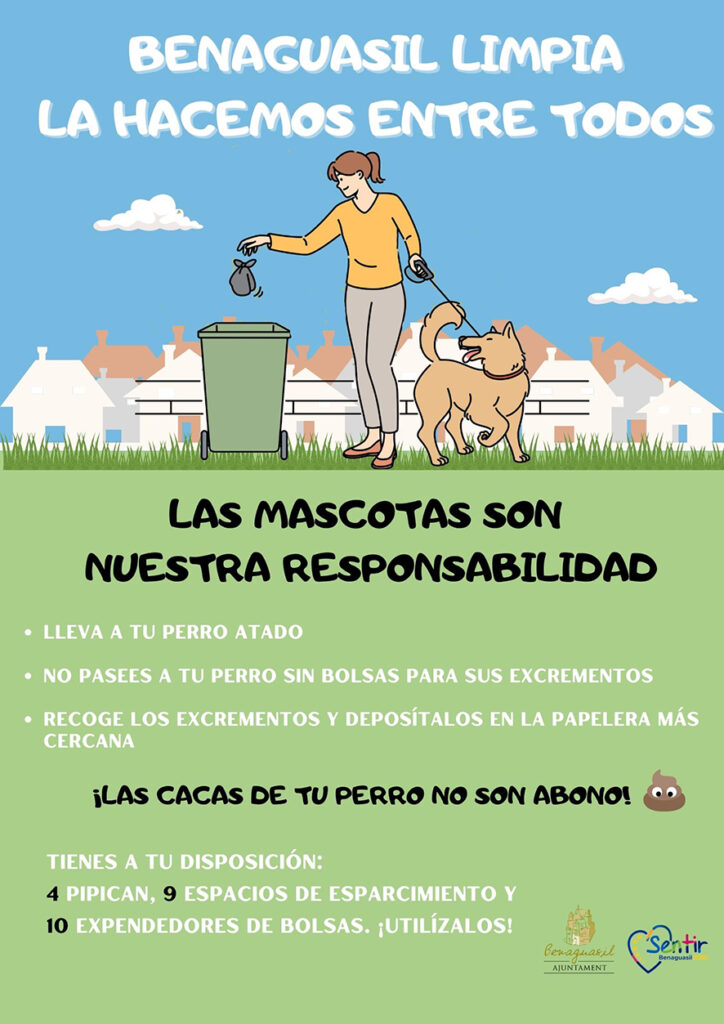 L’Ajuntament de Benaguasil, a través de les regidories de Medi Ambient i Benestar Animal, posa en marxa la campanya “No la cagues, recull-la” per a conscienciar als propietaris de mascotes sobre la necessitat de recollir la femta i desinfectar els orines.