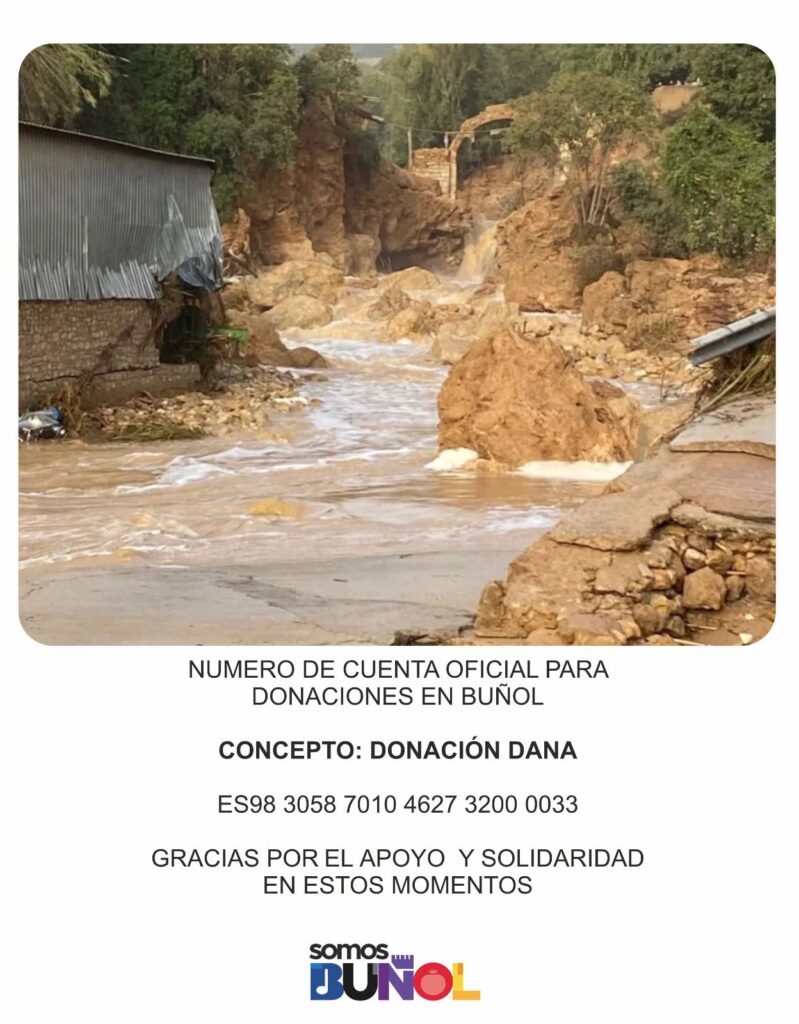 L’Ajuntament de Bunyol ha habilitat un compte oficial per a rebre donacions que seran destinades a fer costat als veïns i àrees més afectades per la recent catàstrofe de la DANA.