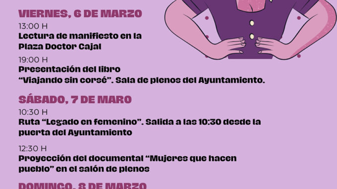 Els actes començaran el divendres 6 de març, a les 13:00 hores, amb la lectura del manifest pel Dia de la Dona en la plaça Doctor Cajal. A la vesprada, a les 19:00 hores, es presentarà en el Saló de Plens el llibre Viatjant sense cotilla, de l’escriptora Margarita Sánchez-Quiñones Pérez, una obra que reflexiona sobre els viatges, la llibertat i les experiències femenines.