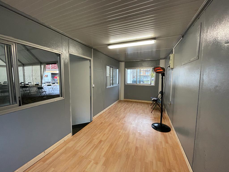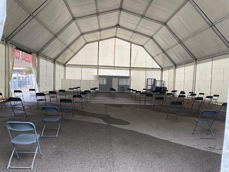 La carpa alberga una caseta de obra donde se guardará el material médico y que utilizará el personal sanitario para realizar las pruebas PCR y los test de antígenos; así como la vacunación, cuando llegue el momento. El resto del espacio será una sala de espera con asientos para 80 personas, guardando la distancia de seguridad. El recinto está dotado de megafonía y sistema de intercomunicación y será desinfectado todos los días de la semana.