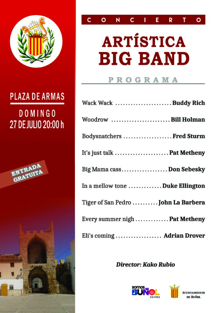 Aquest diumenge 27 de juliol, la Plaça d’Armes de Bunyol es convertirà en un escenari de luxe amb el concert de l’Artística Big band, dirigida per Kako Rubio. La cita musical, d’entrada gratuïta, donarà principi a les 20.00 hores i forma part de la programació cultural impulsada per l’Ajuntament de Bunyol.