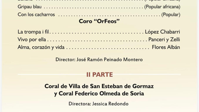 La segona part estarà protagonitzada per les corals convidades procedents de Sòria, dirigides per Jessica Redondo. Com a colofó, totes les agrupacions uniran les seues veus per a interpretar conjuntament peces com Esta tierra i La vida es bella, posant el punt final a una vetlada que promet emoció i qualitat musical.