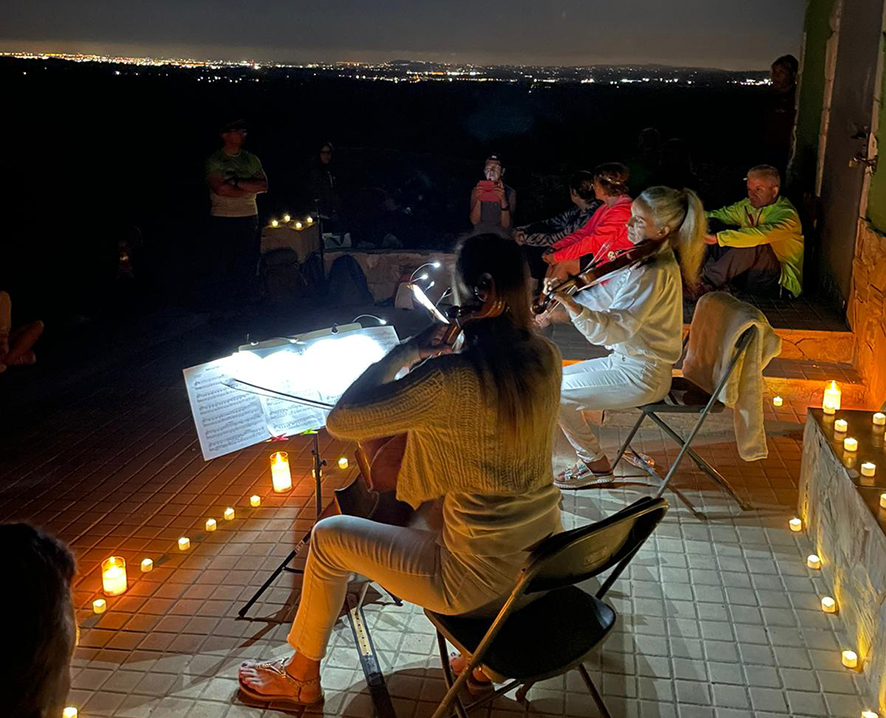 L’activitat va comptar amb la participació de 36 persones i va estar dinamitzada per dues guies de l’empresa CM Plastik, que van donar a conéixer els elements de l’entorn i les peculiaritats del paisatge. A mig camí, l’expedició va realitzar una parada per a sopar en la caseta de vigilància forestal, on l’organització havia preparat un concert sorpresa, a càrrec del duo La meua Ànima, compost per violí i violoncel. Amb l’acompanyament musical, les persones participants van gaudir d’un sopar amb vista panoràmiques, gràcies a la visibilitat facilitada per una lluna quasi plena.