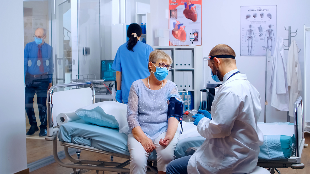 Dcotor checking old retired woman heart related problems during pandemic in modern private clinic or hospital. Patient and medical stuff wearing masks for protection against COVID-19. Medical healthcare