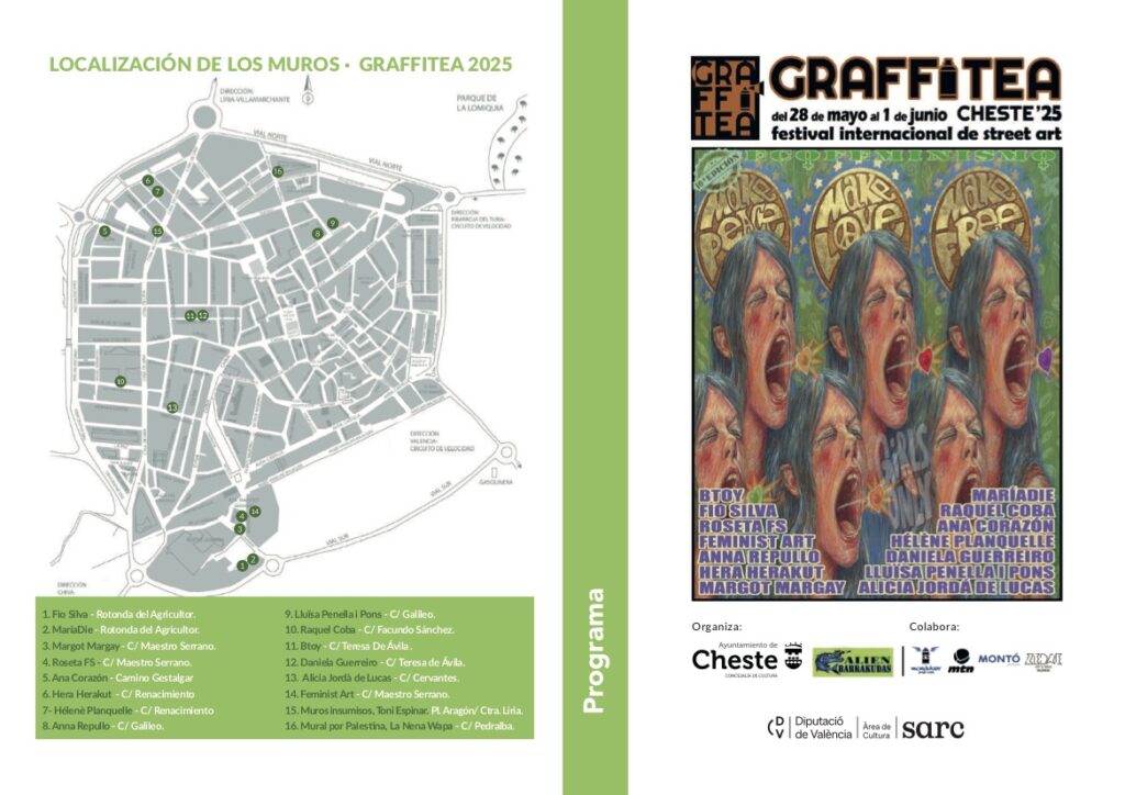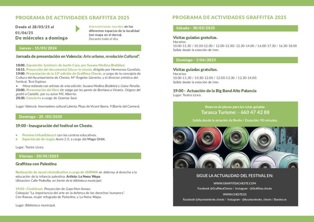 El programa d’activitats de Graffitea Xest 2025 inclou la iniciativa “Graffitea amb Palestina”, divendres que ve, 30 de maig, amb la realització d’un mural per la defensa del dret a l’educació de la infància palestina, en col·laboració amb l’Agència de Nacions Unides per als Refugiats de Palestina a Orient Pròxim (UNRWA), que crearà l’artista valenciana La Xiqueta Wapa en un habitatge del carrer Pedralba, davant de la biblioteca municipal. També es realitzarà un cinefórum temàtic amb la participació d’una persona refugiada que compartirà el seu testimoniatge, a les 19.00 a la biblioteca.