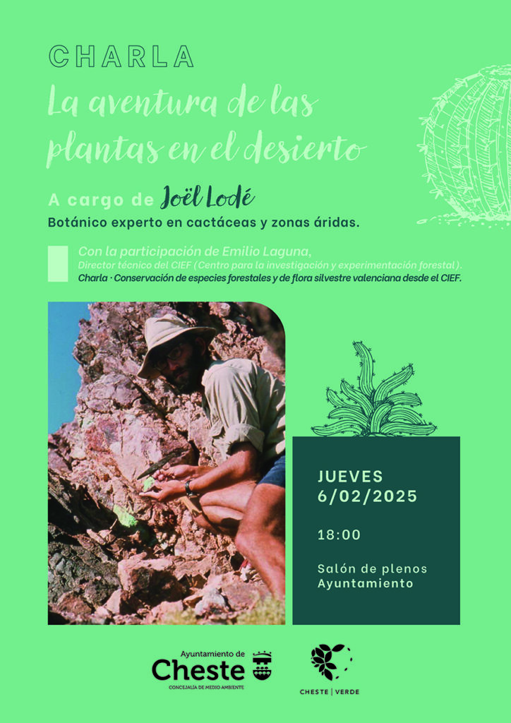 L’Ajuntament de Xest, a través de la seua regidoria de Medi Ambient i Serveis, organitza la xarrada “L’aventura de les plantes en el desert” impartida pel prestigiós botànic Joël Lodé dijous que ve 6 de febrer a les 18.00 hores en el saló de plens de l’Ajuntament. Aquesta ponència, organitzada per la regidoria de Medi Ambient, s’emmarca en les activitats que s’estan realitzant en la ‘Setmana de l’arbre 2025’, una iniciativa que té com a objectiu la conscienciació i educació ambiental del municipi valencià.