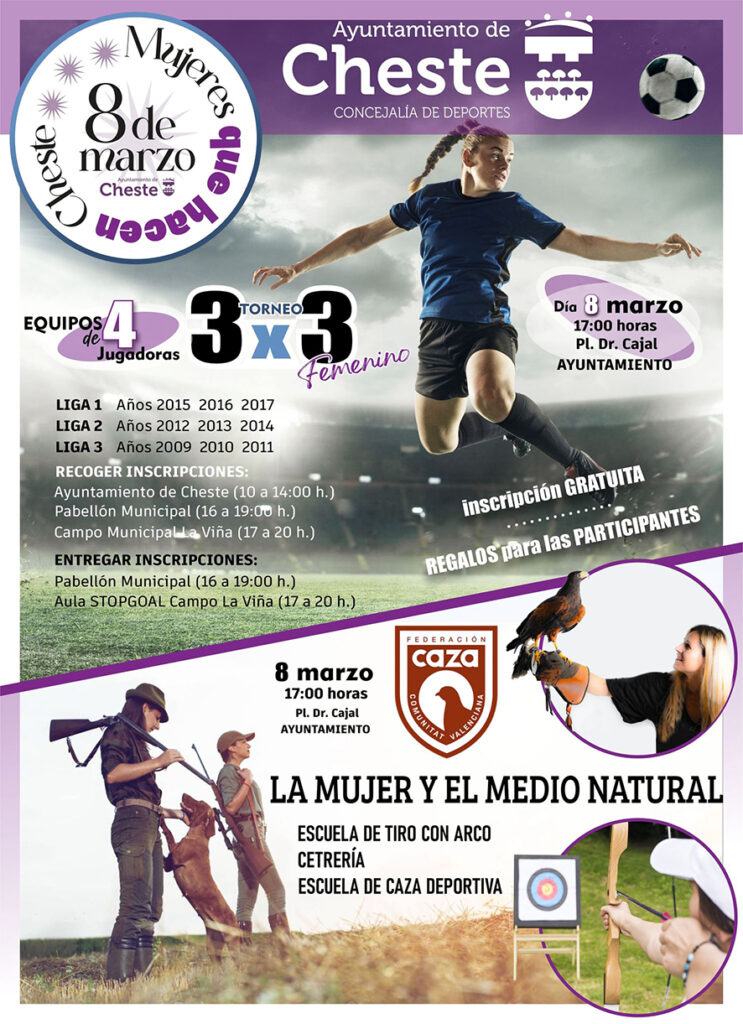 La jornada es tancarà amb activitats esportives gratuïtes en la plaça Doctor Cajal, a partir de les 17.00. D’una banda, se celebrarà un torneig 3×3 de futbol femení. El campionat es dividirà en 3 lligues, depenent de l’edat, i està dirigit a joves i xiquetes nascudes entre 2009 i 2017. La participació és en equips de 4 jugadores i les inscripcions estan disponibles a l’Ajuntament, en horari de 10.00 a 14.00; en el pavelló municipal, de 16.00 a 19.00, i en el camp La Vinya, de 17.00 a 20.00. El lliurament de les fitxes es farà en l’el pavelló, en la manyaga horària, o a l’Aula Stopgoal del Camp La Vinya, en horari de 17.00 a 20.00. Paral·lelament hauran diferents espais en la plaça dedicats a activitats relacionades amb la Dona i el Medi rural, com el tir amb arc, la falconeria o la caça esportiva, a càrrec de la Federació de Caça de la Comunitat Valenciana.