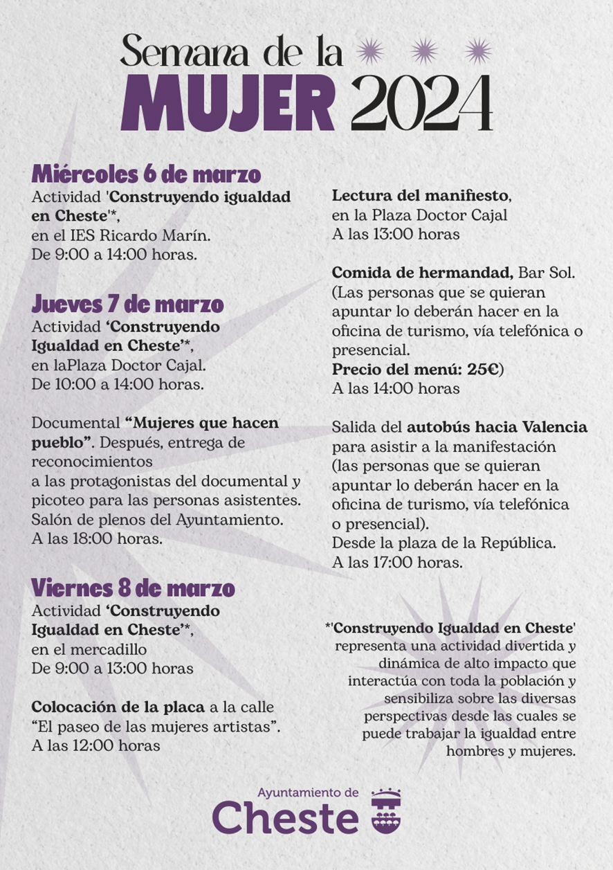 Durante la próxima semana Cheste acogerá diferentes actos en el marco de la Semana de la Mujer 2024, una iniciativa de la Concejalía de Igualdad para conmemorar el 8M, Día Internacional de la Mujer.