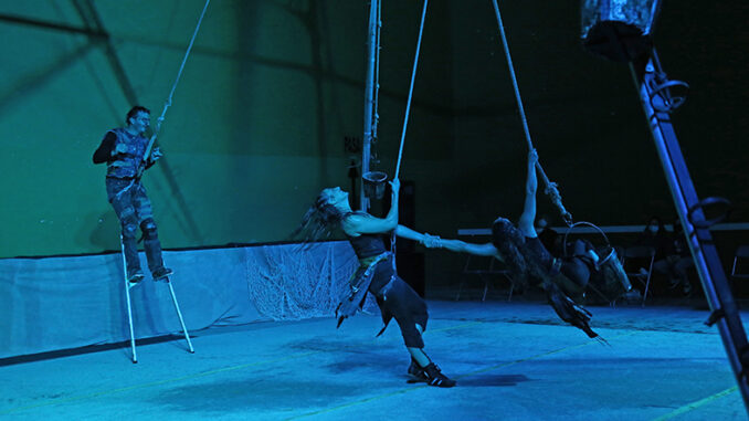 Ayer, domingo 4 de octubre, continuaban los actos programados con motivo de la celebración de la XLVII Fiesta de la Vendimia, con el estreno del novedoso Cheste inusual, Festival de arte en sitios singulares. La apertura fue a cargo de la compañía valenciana NUC con su espectáculo de danza aérea Aigua, que finalmente tuvo que representarse a cubierto, en el frontón Barón de Cheste, debido a las rachas de viento. La actuación se desarrolló en una estructura metálica en forma de pirámide, de 10 metros de altura, en la que tres artistas danzaron e hicieron acrobacias de vértigo en el marco de una puesta en escena que pretendía hacer reflexionar al público sobre el paso de los humanos por el Planeta.