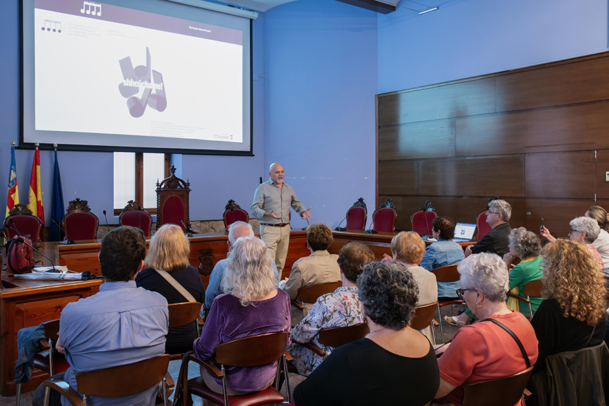 El salón de plenos del Ayuntamiento ha acogido este pasado martes, 15 de octubre, la primera sesión del proyecto de divulgación musical Shhcúchame!, una nueva propuesta de la programación cultural de Cheste que pretende formar a las personas participantes en la escucha musical inteligente.
