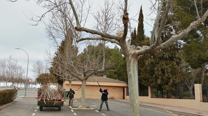 Tras la poda ejecutada con uso de máquina elevadora en árboles de gran altura y dimensiones, los operarios del Ayuntamiento de Utiel están desarrollando las labores de poda regular de árboles en avenidas, calles, paseos y zonas verdes del municipio.