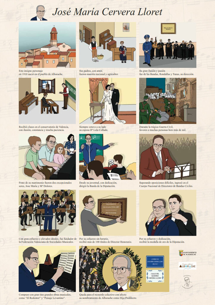 El Concejal de Cultura del Ayuntamiento de Alborache, Vicente Darder, destaca “la importancia del maestro Cervera para la música valenciana, tanto como compositor como en su papel de pedagogo y director de diversas bandas, en las que ha dejado su impronta. Nos hubiera gustado rendir el merecido homenaje a José Mª Cervera con música en nuestro pueblo, pero las restricciones debido a la COVID-19 lo han hecho imposible. El auca que presentamos ahora nos permite mantener viva su memoria y difundir su obra en los colegios, para que los niños y niñas también lleguen a apreciar, con un lenguaje sencillo y una presentación amena, la importancia de su figura”.