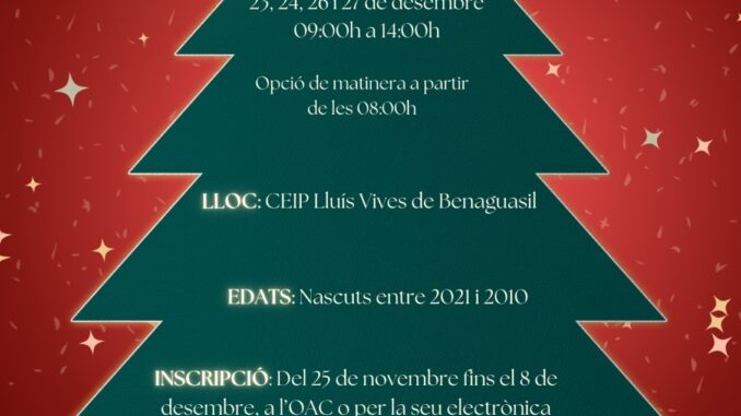 Este servicio, que se realizará durante los días 23, 24, 26 y 27 de diciembre en las instalaciones del CEIP Luis Vives, está dirigido a niños y niñas nacidos entre 2010 y 2021, en horario de 9:00 a 14:00 horas con opción de matinera desde las 8h.
