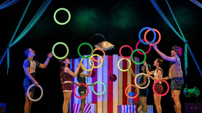 Se trata de un espectáculo itinerante que combina acrobacias, malabares y participación del público con un tono humorístico y festivo. La pieza ha sido galardonada con el Premio FETEN 2025 al mejor espectáculo itinerante, premio que consolida el trabajo de esta compañía dentro del panorama estatal.